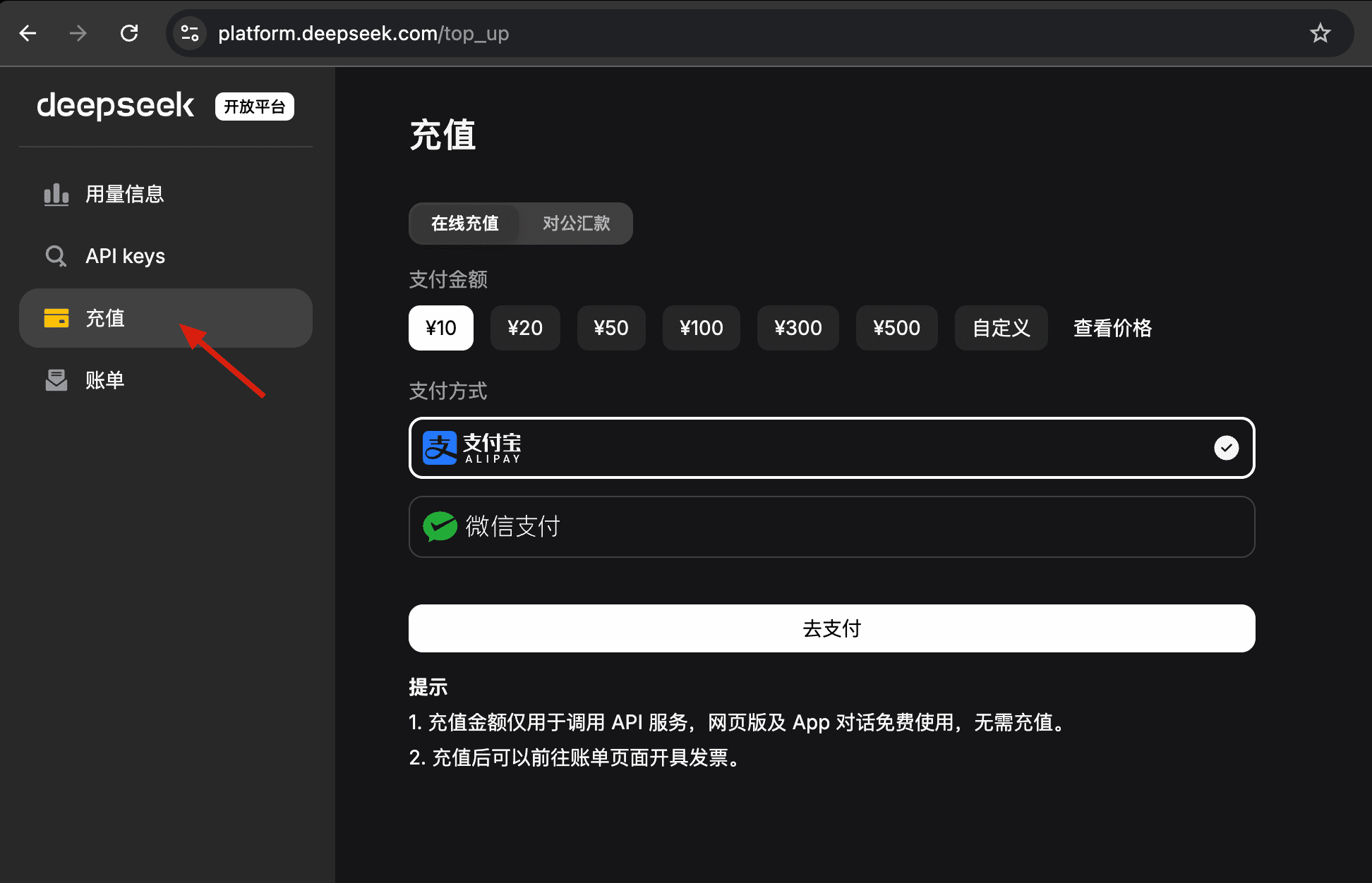 - 选择左侧充值,充值你所需要的金额(建议先充 10 块钱,足够用很久了)