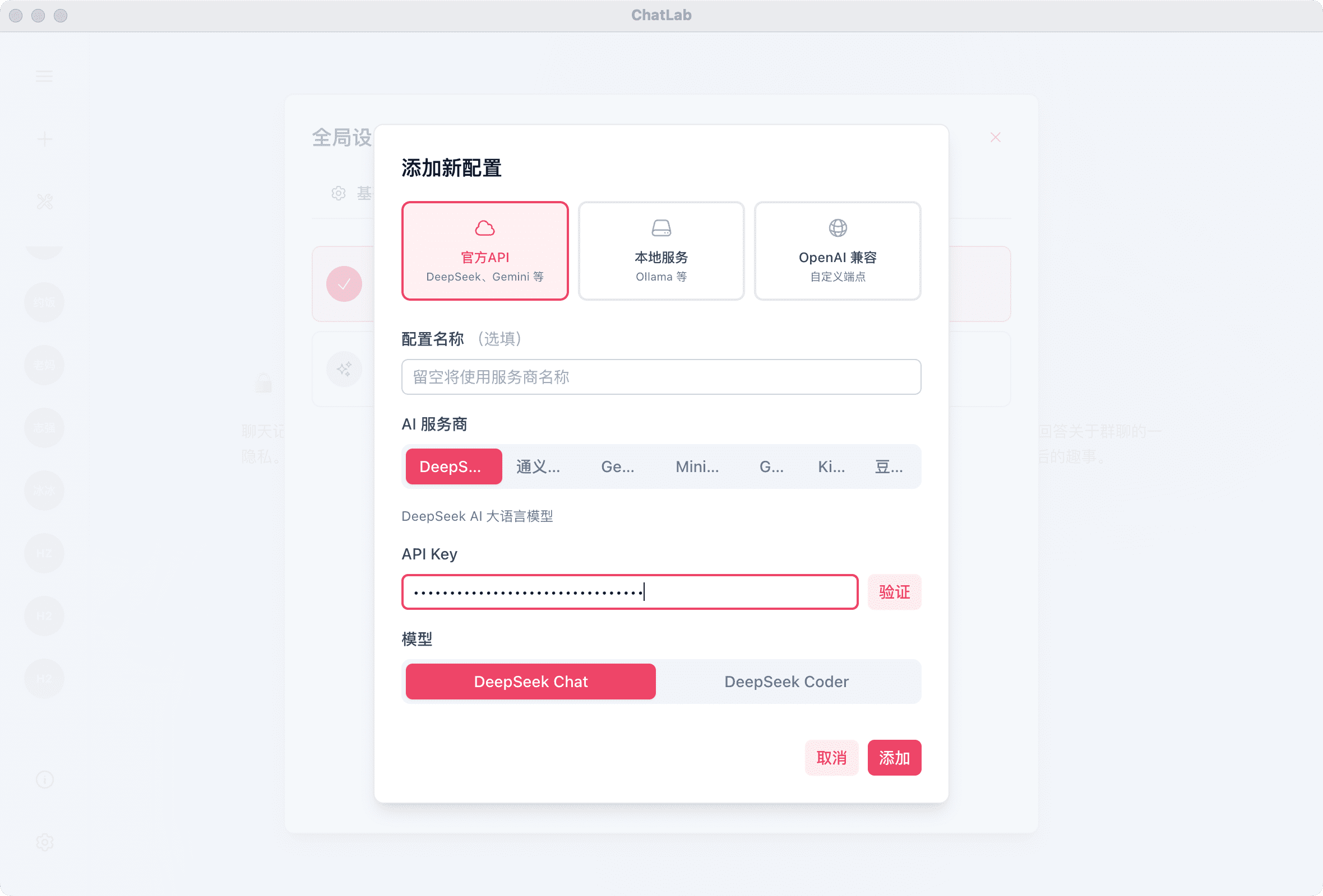 - 打开 ChatLab,右下角点击设置,然后「模型配置」>「添加新配置」