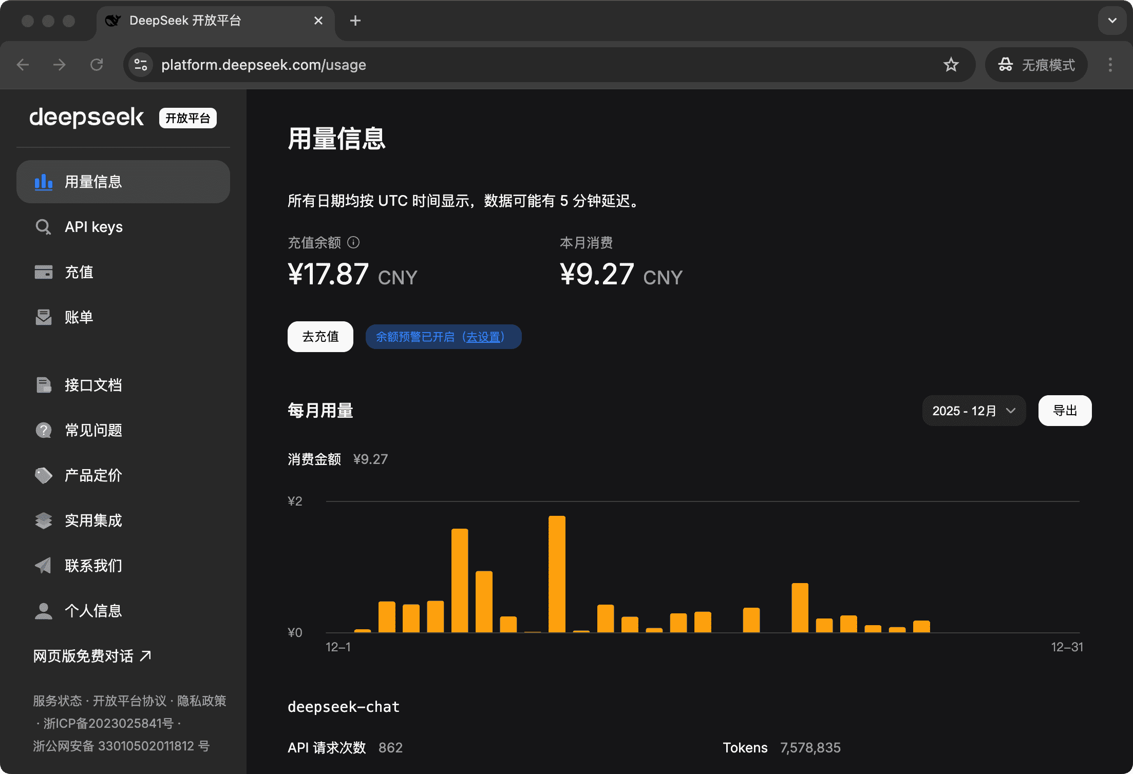 - 在左侧的用量信息中,你可以查看你充值和消费的额度